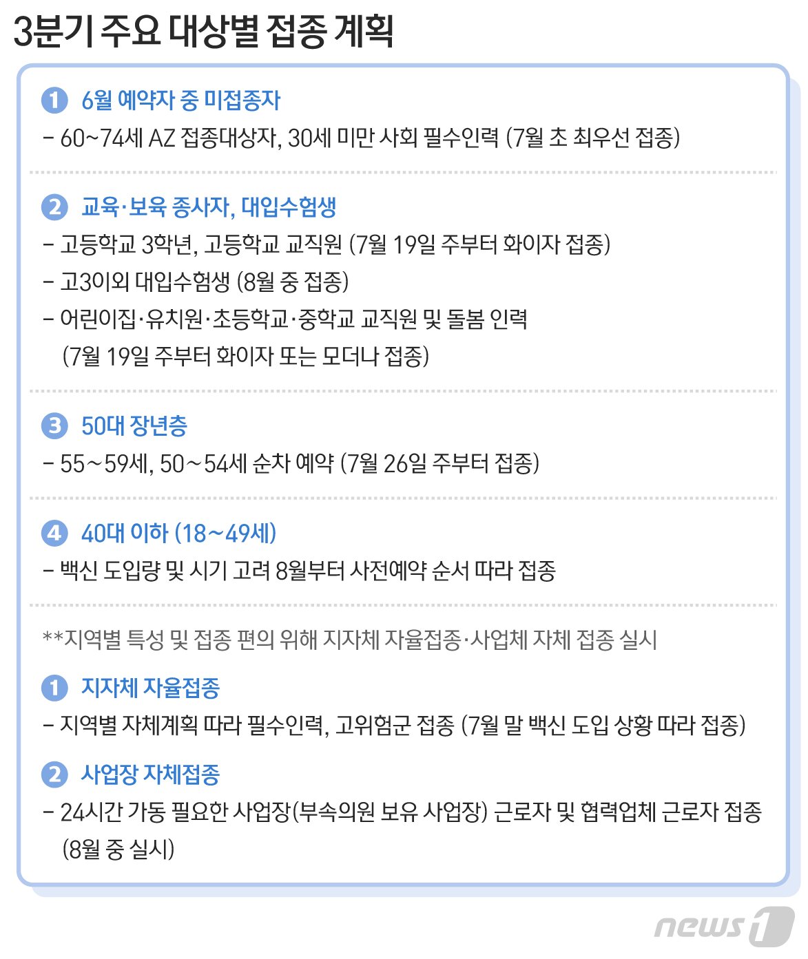 정부는 상반기 접종을 코로나 고위험군인 60대 이상 고령자를 우선 순위로 한다는 방침을 정했습니다. 고3을 제외한 수능 수험생에대한 접종은 3분기 계획 발표때 나올 예정입니다. 잔여백신인 아스트라제네카를 접종 받을 수 있고, 얀센 백신도 사전 예약 후 남은 백신에 대해 고령층 우선으로 접종할 계획입니다. 국내에 들어온 백신 중 만 16세 이상에게 허용된 백신은 화이자 백신 뿐이라서 그렇습니다. 3분기엔 화이자 5900만 회 분과 모더나 4천만 회분, 얀센, 노바백스 까지 추가로 들어올 예정입니다
